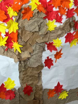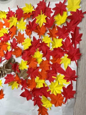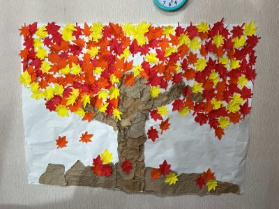 利用者様みんなでモミジを作り、木の幹を貼り完成しました!!